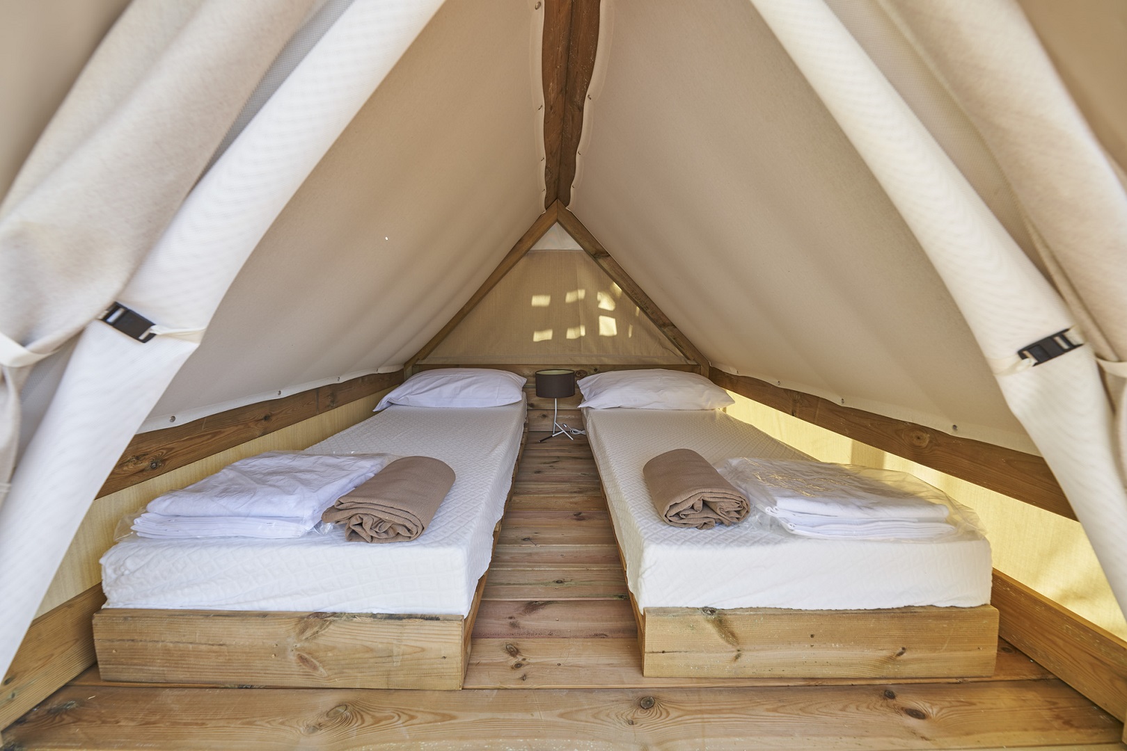 La tendina più piccola, dependance affiancata al glamping principale, è dotata di due letti singoli, illuminazione interna con abat jour e prese elettriche per la ricarica dei dispositivi elettronici.