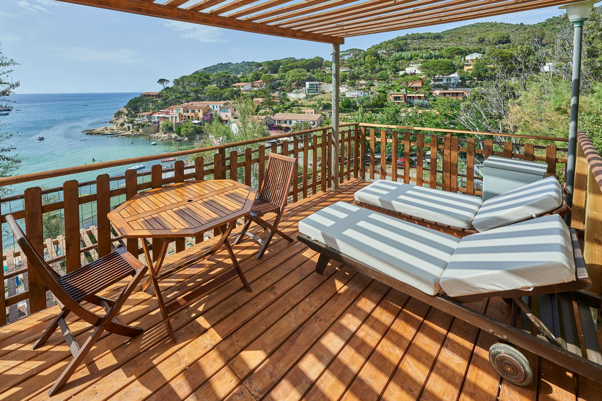 Situate nella parte più alta e privilegiata del complesso, queste deliziose camere finemente arredate offrono un ingresso indipendente e una vista panoramica sui tramonti che colorano il Golfo della Biodola. Disponibili come camere matrimoniali (o doppie), con possibilità di 3° letto, sono dotate di un